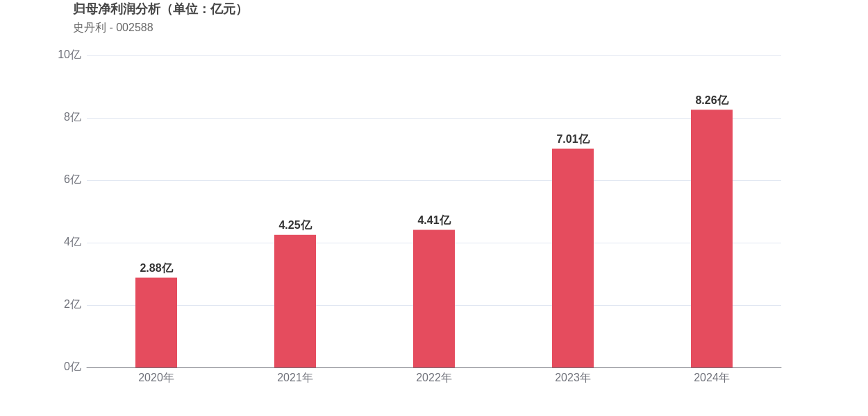 利润角度分析,2020年史丹利实现归母净利润2.88亿元,2024年8.26亿元。归母净利润在五年间实现了近三倍的增长,盈利能力显著提升。